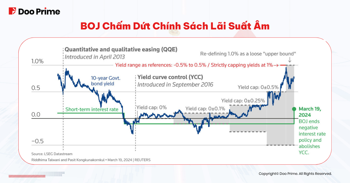 Bằng cách tăng lãi suất, Ngân hàng Nhật Bản chính thức chấm dứt kỷ nguyên lãi suất âm cùng các chính sách kiểm soát đường cong lợi suất, vốn đã được áp dụng từ năm 2007. Bên cạnh đó, động thái này còn nhấn mạnh một cách rõ ràng hơn cam kết của Nhật Bản trong việc đạt được mục tiêu lạm phát là 2%.