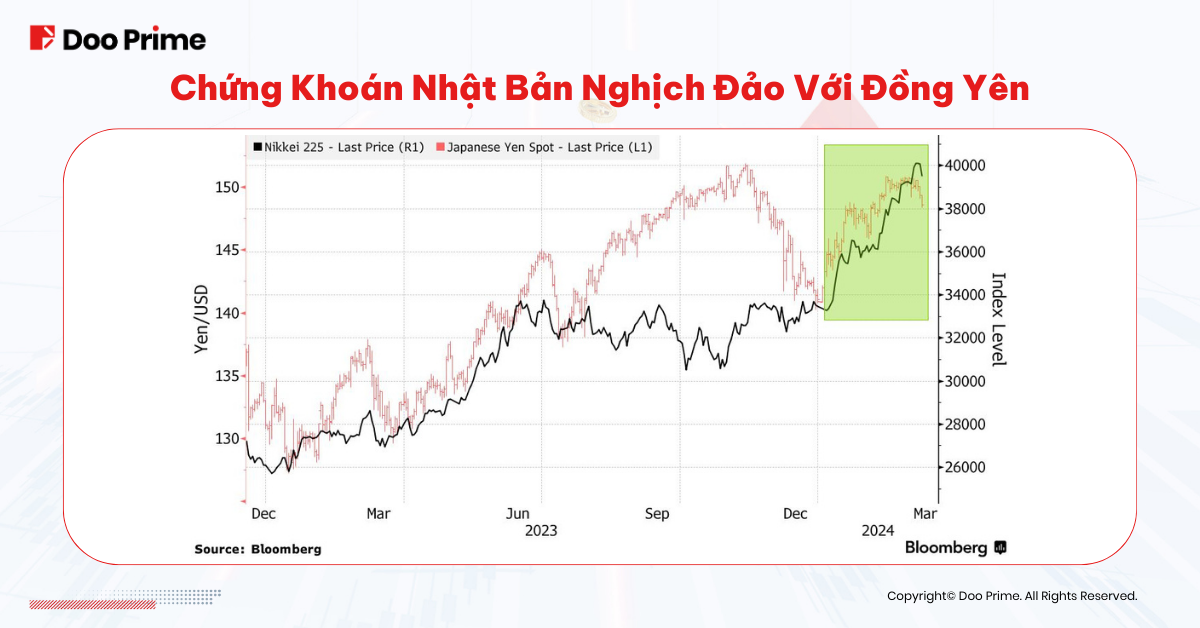 Mối tương quan nghịch biến giữa chỉ số Nikkei và đồng yên giúp ta nhận ra rằng, thị trường chứng khoán mạnh thường đi kèm với sự mất giá của đồng yên.