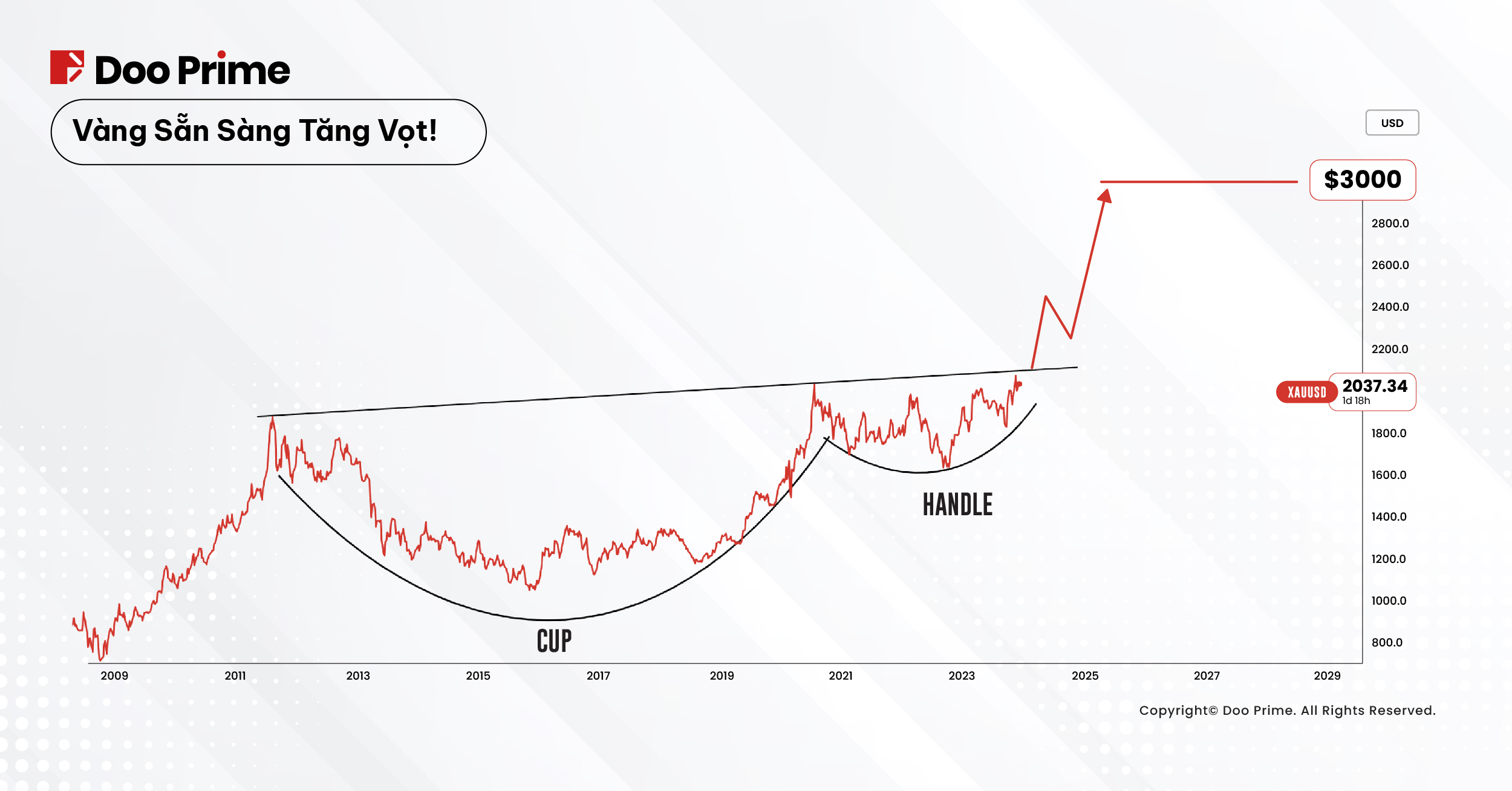 Biểu đồ vàng đã cho ra mô hình giá Cup & Handle (cốc và tay cầm) phổ biến, cho thấy khả năng vàng có thể sẽ tăng lên mức 3000 USD nếu mức kháng cực 2100-2150 bị phá vỡ.