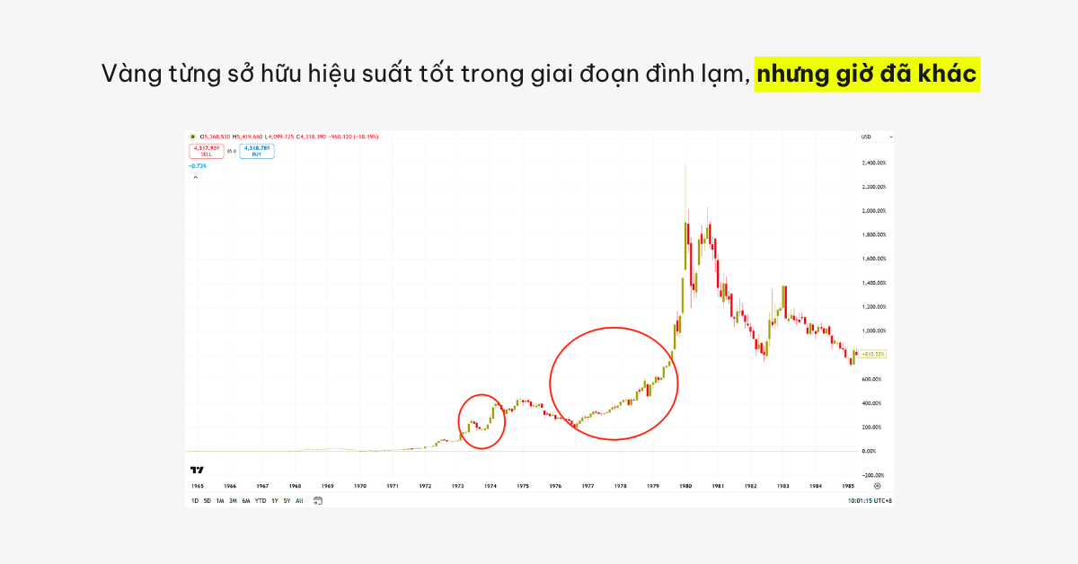 Trong lịch sử, vàng thường hoạt động tốt trong giai đoạn đình lạm. Lúc này, lạm phát tăng hỗ trợ giá hàng hóa. Tuy nhiên, thực tế hiện nay lại là một bức tranh hoàn toàn khác: