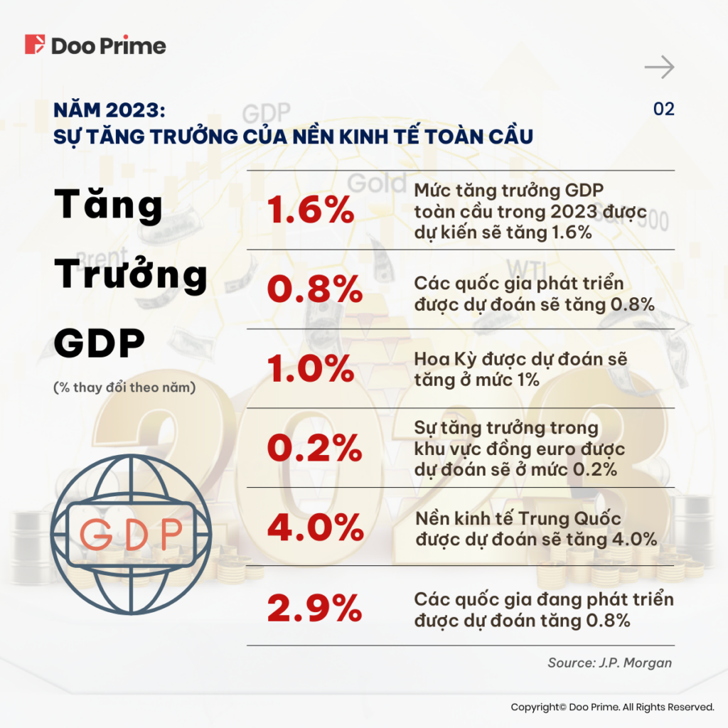 Dựa trên dự đoán về triển vọng của thị trường trong năm 2023 của J.P. Morgan, có thể nhận thấy rằng, GDP toàn cầu trong năm sắp tới dự kiến sẽ tăng 1.6%. Sự tăng trưởng của các quốc gia phát triển, Hoa Kỳ và các quốc gia trong khu vực đồng euro được dự đoán sẽ lần lượt ở mức 0.8%, 1% và 0.2%. Trong khi đó, nền kinh tế Trung Quốc được dự kiến sẽ tăng trưởng 4.0%, còn riêng các quốc gia đang phát triển được đánh giá là sẽ tăng 2.9% vào năm 2023.